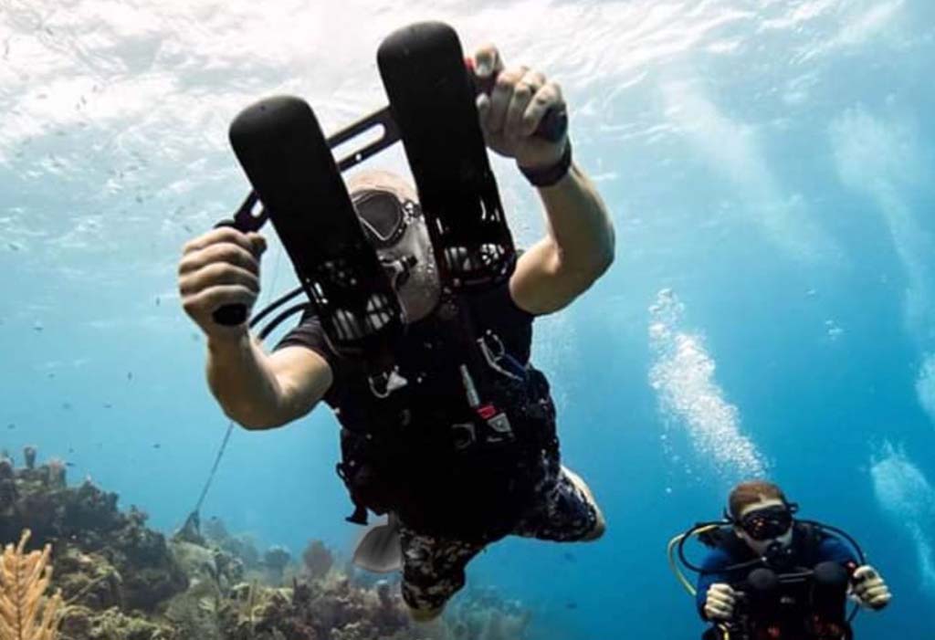 Fly around underwater with your own underwater propulsion vehicle. Conserve energy and air and go further.